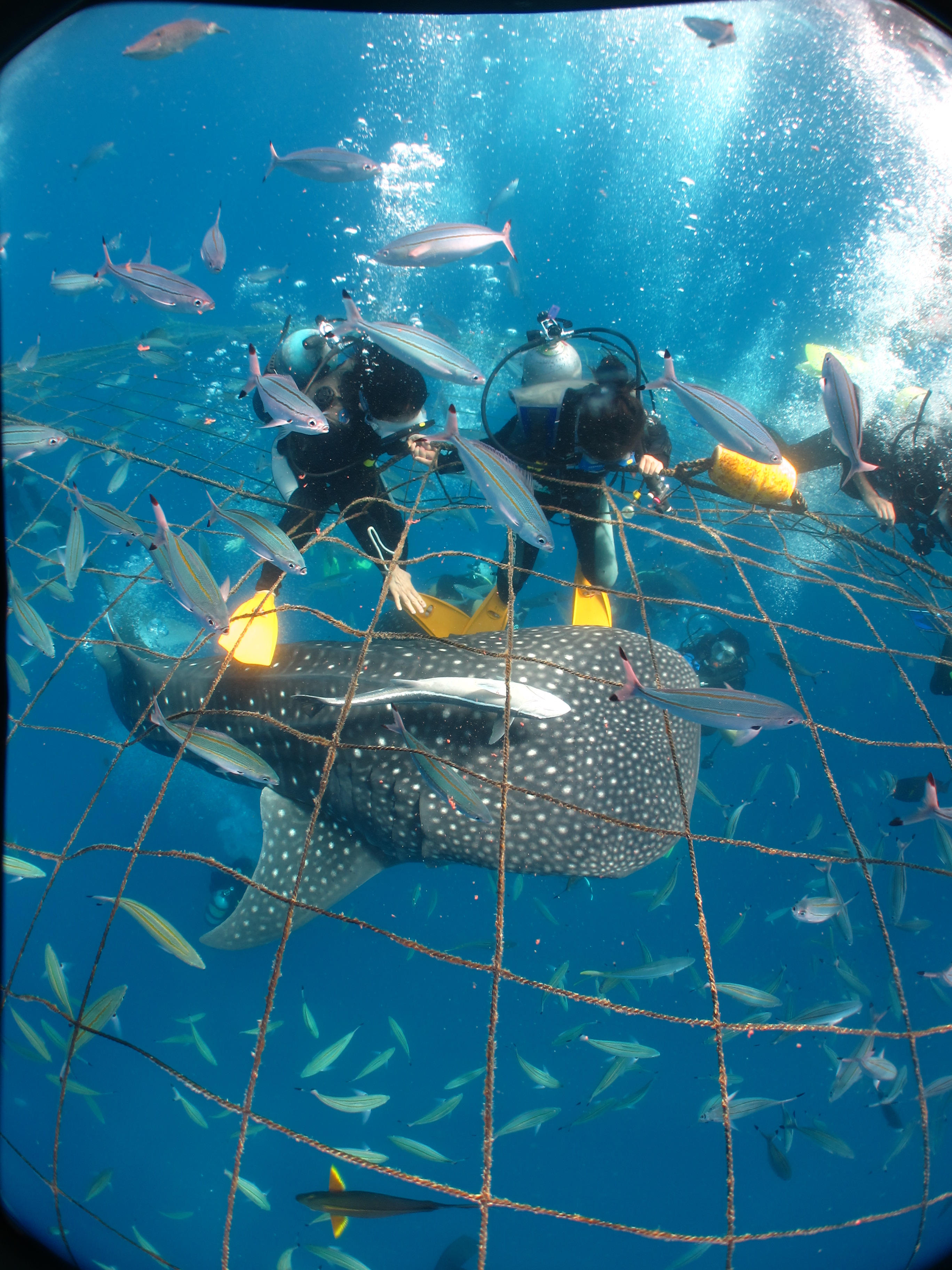 ・ファンダイビングの方はこの網の外からジンベイザメに手が届きそうな距離でジンベエザメの餌付けを見ることが出来ます。ファンダイビングならではの網の上からだけでなく横に回って見たり、その周りにはここ数年ギンガメアジの群れも住み着いてますのでギンガメアジの群れにアタック出来ます