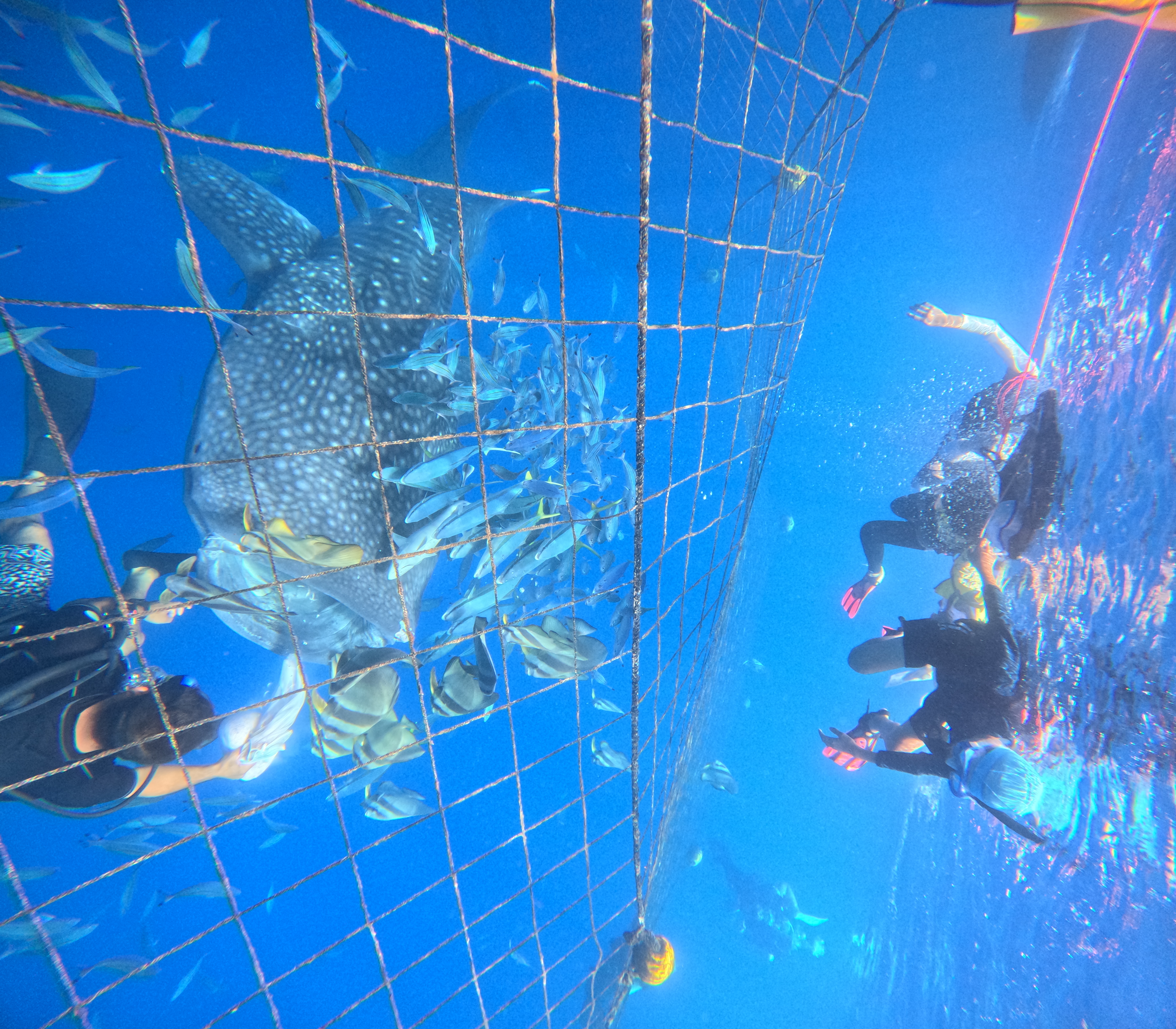・スノーケルの方は網の上から大迫力のでっかいジンベエザメの餌付けを見る事が出来て、その後は周りを泳ぐほかの魚たちには自分で餌付けすることが出来ます。想像以上に近くて見れて感動間違いなし